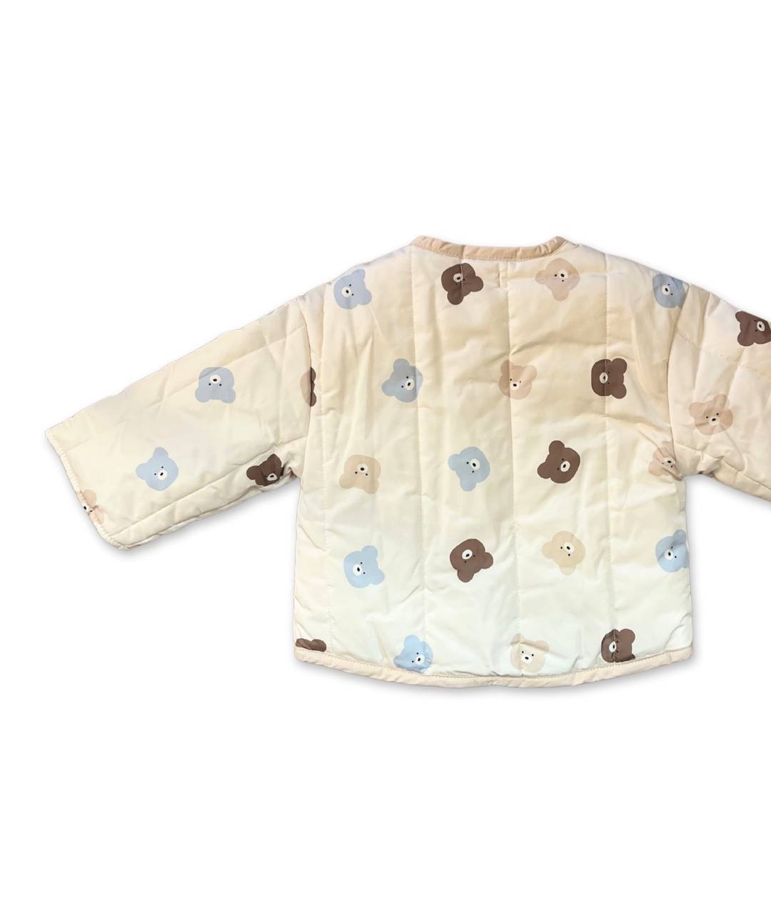 Die Baby-Steppjacke BJOR ist weich gepolstert und angenehm leicht zu tragen. Die glatte Oberfläche fühlt sich sanft an, das dezente Allover-Motiv mit kleinen Bären und leichten Farben wirkt ruhig und stimmig.